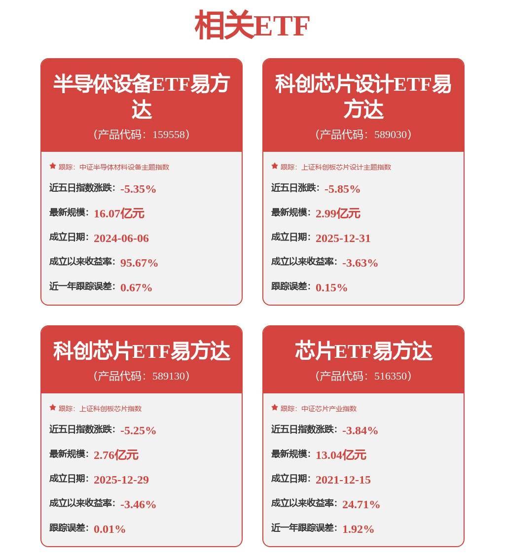 中证芯片产业指数全面覆盖芯片全产业链,数字芯片设计、半导体设备、集成电路制造行业分别占比51%、20%和10%;上证科创板芯片设计主题指数则聚焦芯片设计领域,数字芯片设计行业占比近80%。芯片ETF易方达(516350,联接基金A/C:018411/018412)、科创芯片设计ETF易方达(589030)跟踪以上指数,可一键布局国产芯片发展机遇。