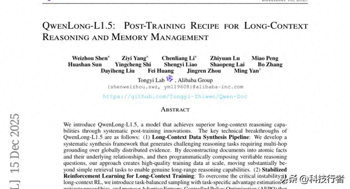由阿里巴巴通义实验室的沈维州、杨子懿、李晨亮等研究人员组成的团队,于2025年12月在arXiv平台发表了一项突破性研究,论文编号为arXiv:2512.12967v1。这项名为QwenLong-L1.5的研究,首次实现了让AI模型在超长文本中进行复杂推理的技术突破,其核心能力可以处理高达400万字的文档,相当于十几本小说的长度。